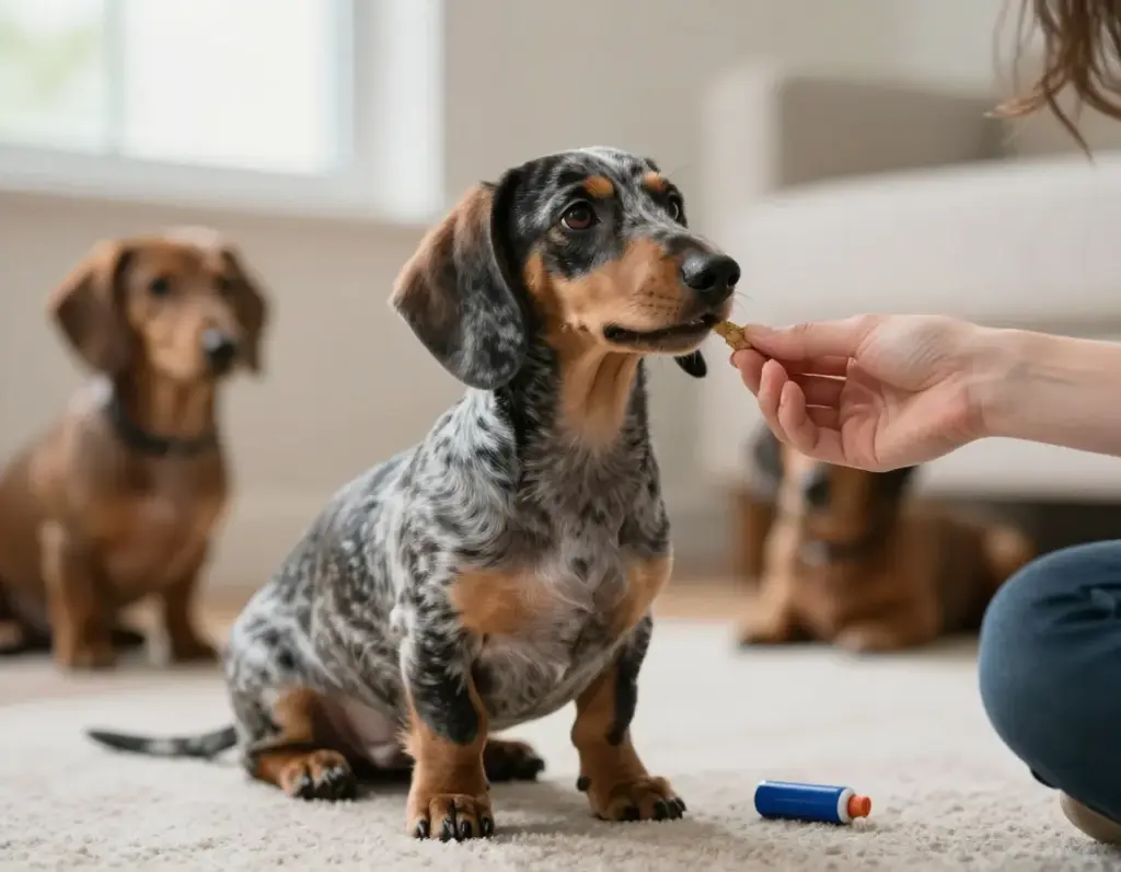 Resource guarding prevention should start immediately with your Dachshund puppy. Their strong personalities can sometimes manifest as possessiveness over food, toys, or favorite spots. Address this behavior early by gently touching your puppy during meals and occasionally hand-feeding to establish positive associations[2].