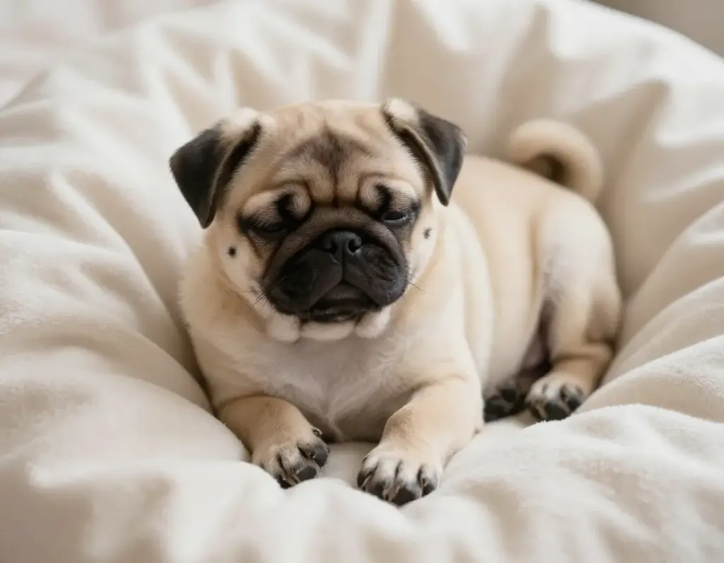 Nothing quite compares to the sight of a pug puppy in peaceful slumber, tiny wrinkles relaxed and miniature paws twitching with dream adventures. This first image captures a fawn-colored pug puppy no more than eight weeks old, curled into a perfect circle on a soft cream blanket. The puppy’s wrinkles are just beginning to form, creating gentle valleys across its forehead that will deepen with age into the characteristic pug expression we all adore.